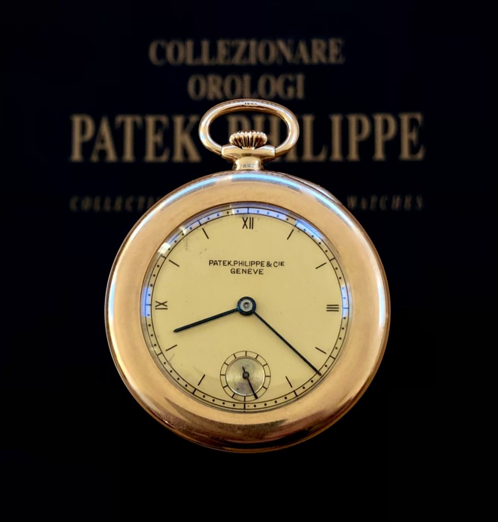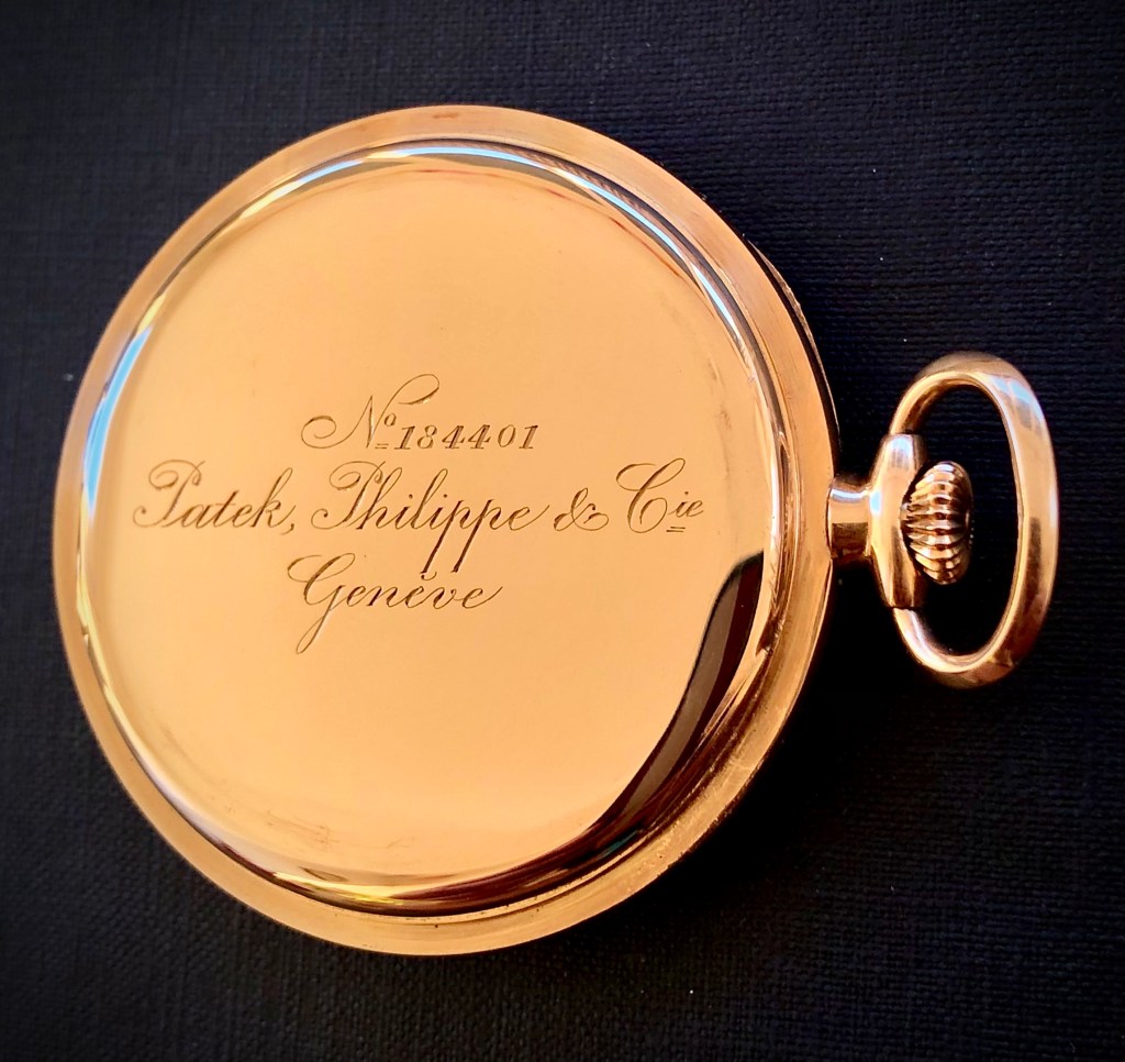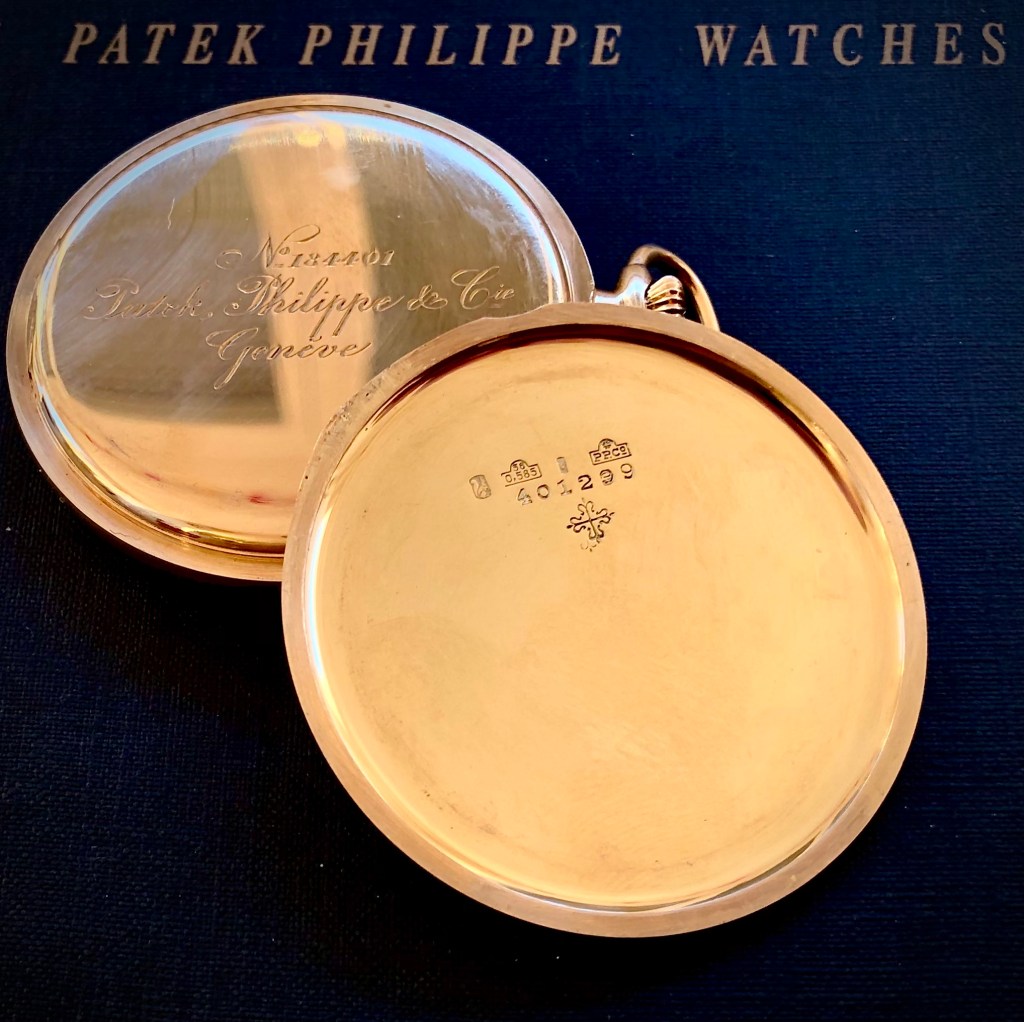 Very slim, gold cased (14k rose gold) pocket watch. Snap case back (14k rose gold), Inside stamped with production info and case number #401209 and gold hallmarks. Hinged inner ‘cuvette’ engraved on the outside ‘No.184401 Patek Phillipe & Cie Genève’. Original, yellow gold dial printed in black ‘Patek Philippe & Cie Genève’ at ’12’ . Subsecond at ‘6’. Black printed minute track, black Roman numerals alternating with black printed stick indexes). Gold bow and crown. Original blued hands.