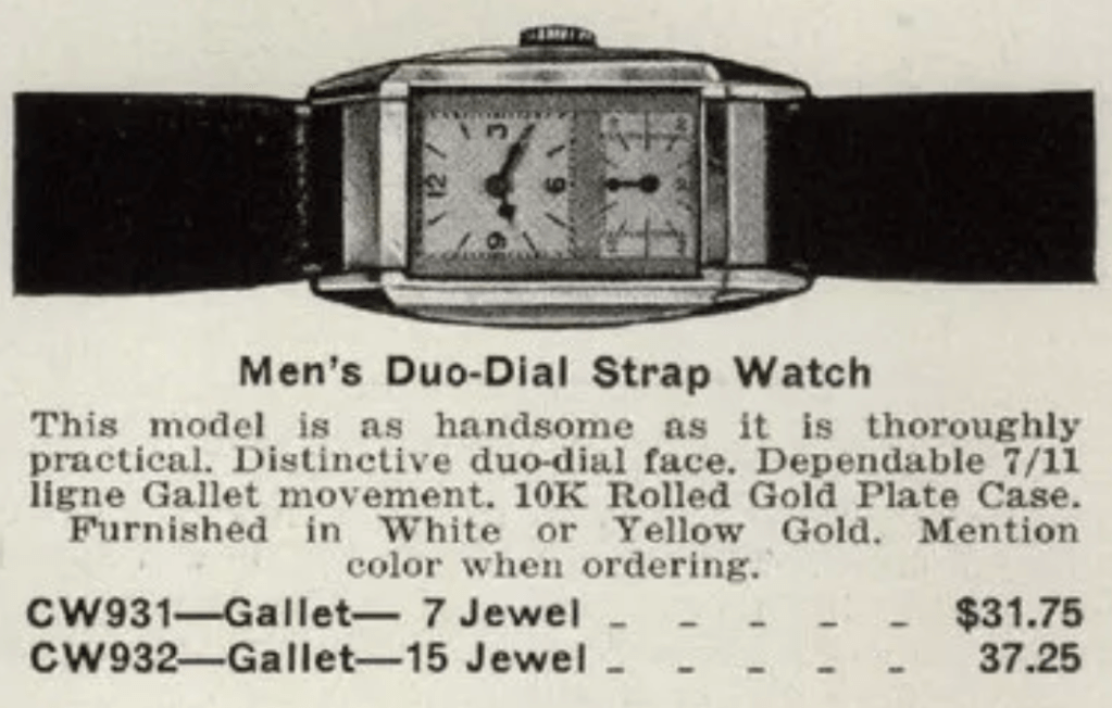 Additional info: Gallet was a very important watch manufacturer during WWII, specialising in Chronographs. This watch although of small size, was made as a ‘gent’s’ watch as shown on the picture of a period advertisement for this model below (with slightly different hands and dial). Very few of watches of this type survive from the manufacturer Gallet.