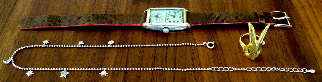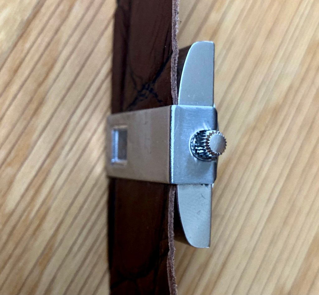 Strap: Hand made, recto: shiny brown leather (toad, Australia), verso: black leather (goat, Germany) with gold plated brass buckle, vintage, style and age matched to the watch, but unbranded, from the 1930/40ies..