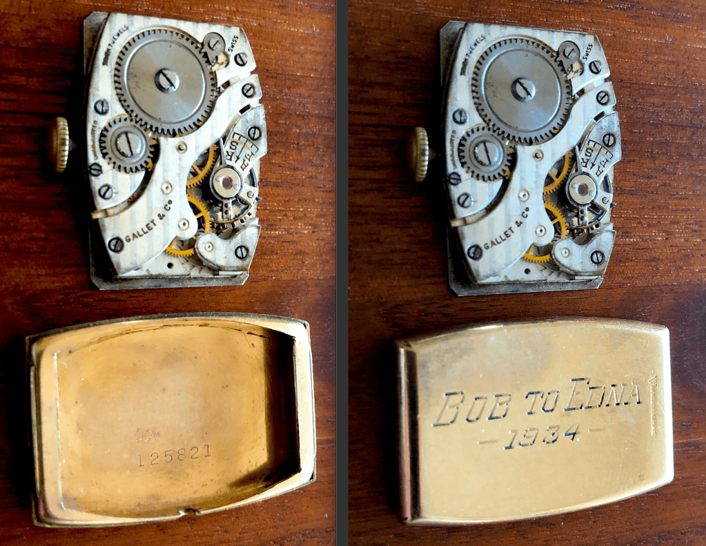Very rare, case of rolled yellow gold over brass. So called ‘doctors’ dress watch. Snap watch case back in rolled gold over brass. Outside engraved with ‘Bob to Edna – 1934 -‘, inside stamped with production number ‘125821’. Case showing typical, linear ‘Art Deco’ decoration on sides, crown side showing remnants of soldering. Two tone, patinated, silver dial separated into two vertical, square sectors. Upper sector showing hours and minutes, surrounded by a square printed ‘railway’ minute track containing Arabic numerals. Lower sector with round track for showing seconds, marked ‘Swiss’ at low left border. All original blued steel hands. Original gold plated crown.