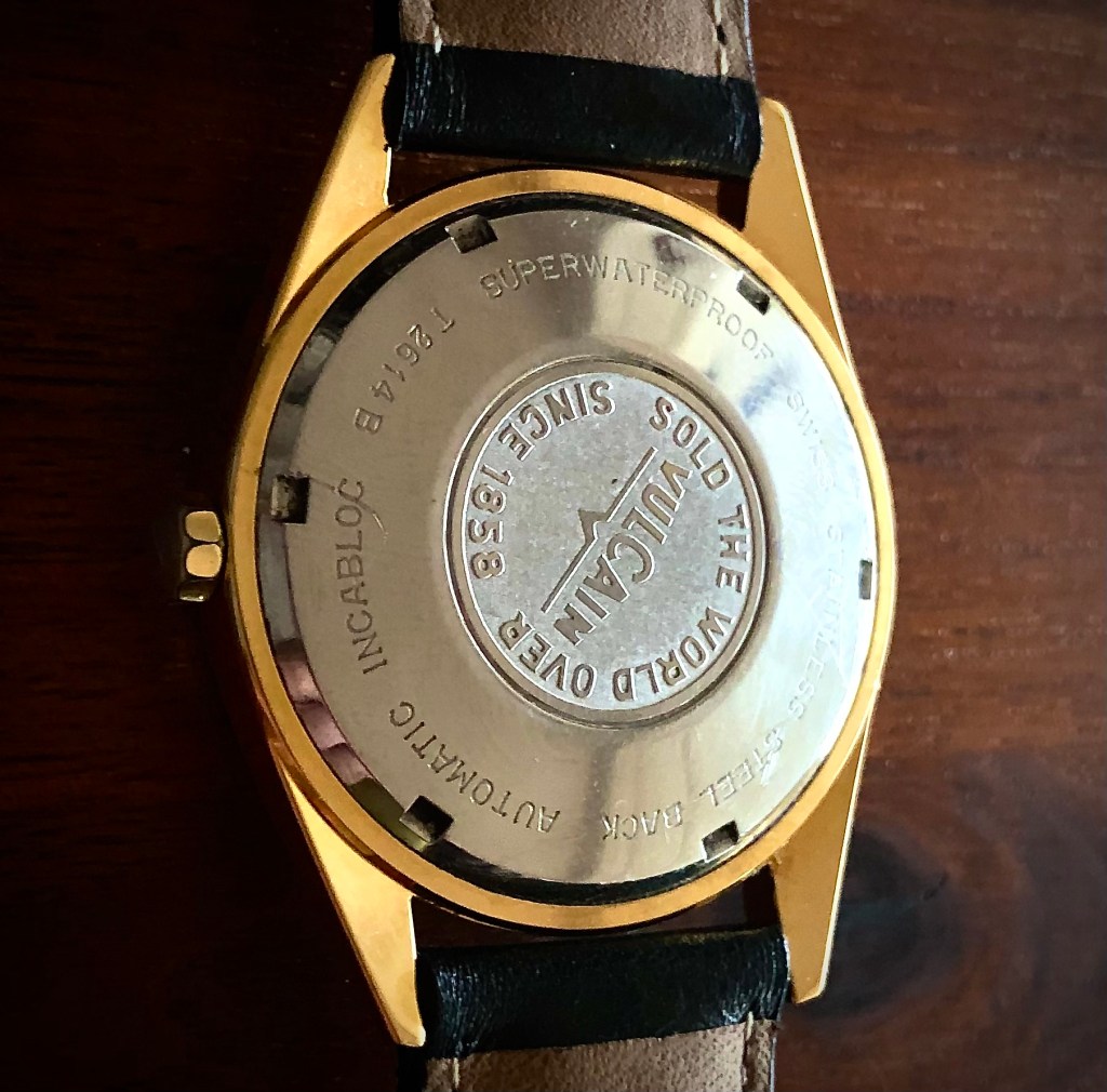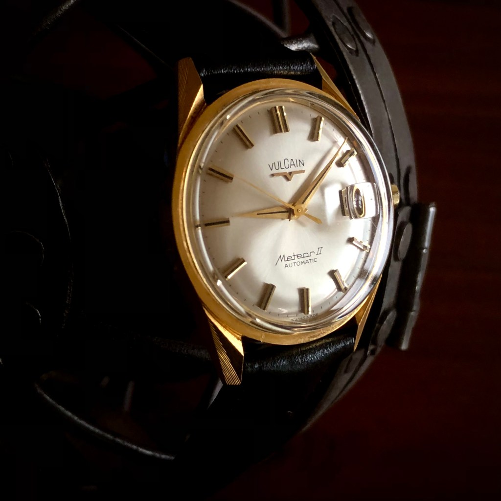 Gilt (20 micron) brass cased dress watch. Screw down stainless steel case back, outside stamped with production info. Original, silvered dial printed in black ‘Vulcain’ at ’12’ and ‘Meteor II Automatic’ at ‘6’. Black printed minute track and raised gilt, multifaceted hour markers. Raised, gilt Vulcain logo at ’12’. Date window at ‘3’. Original gold plated brass crown with losses. Original gilt hands partially with black details. Original crystal with intruding date lens.