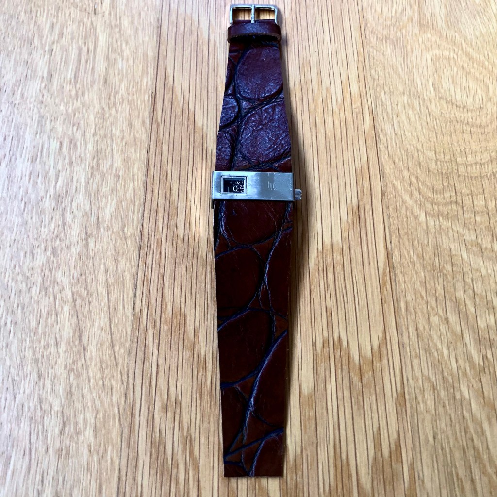 Rare, plated base metal cased watch. Screwed stainless steel case back. Inside of the case back marked with company info. Outside of the case back marked with watch features. Stainless steel brace for bracelet or strap retention, featuring stamped firm logo. Small, original, white printed, black rotating discs for hours, minutes and seconds. Original, small acrylic crystal with red, horizontal line for time reading. Original crown.