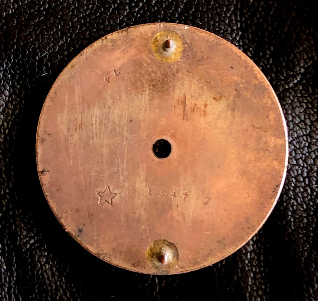Exceedingly rare, original Rolex Centregraph ‘double name’ sector dial. Dial was made by ‘Stern Frères Geneva’ which provided all dials for Rolex at that time. Both dial feet present and in original state (not re-soldered). Recto: copper coloured matte centre (with black printed outlines of numbers 12, 3, 6, 9, once filled with luminous material, now lost), black printed (now faded) ‘Rolex Oyster Chromomètre Centregraph’ below ’12’ and retailer ‘Mappin’ (Mappin & Webb, jewellery and watch retailers in Britain since 1775 and still operating) above ‘6’. Shiny copper coloured ring in periphery, surrounded by dark copper coloured matte ring featuring black printed ‘railway’ minute ring. Small punch mark on the rim at ‘3’, enabling correct placement of the print. Verso: showing stamps of a star for ‘Stern’ manufacturers and production/model number ‘1347 2′ with separately stamped number ’74’ (client code number 103 for Rolex has been introduced after 1940).